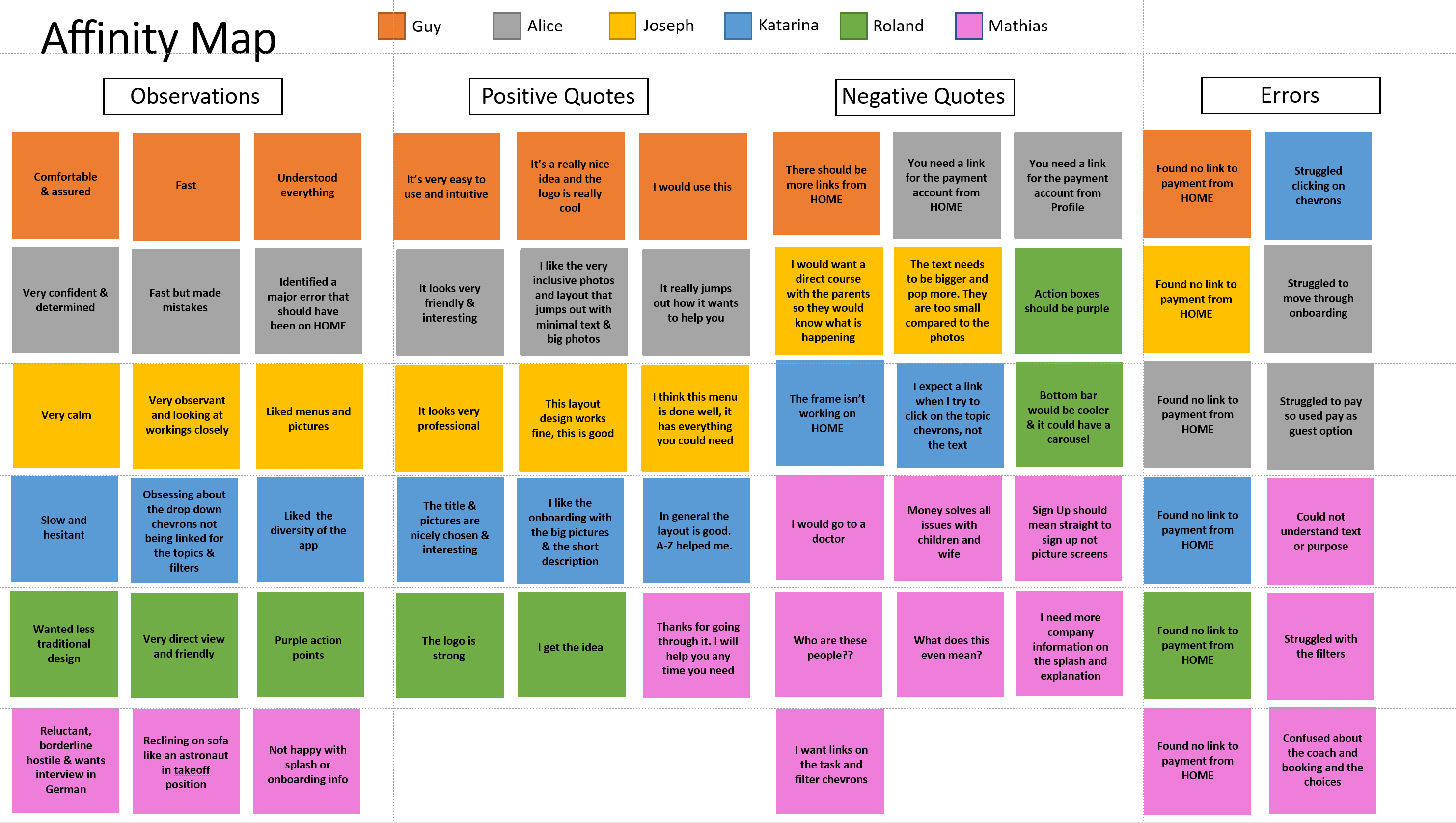 The Usability Test threw up some great results. People were able to navigate it easy and fast but there were one or two issues with payment from the start point rather than as a follow on from the booking. There were also issues with onboarding, splash screen information and button and the filter chevrons.