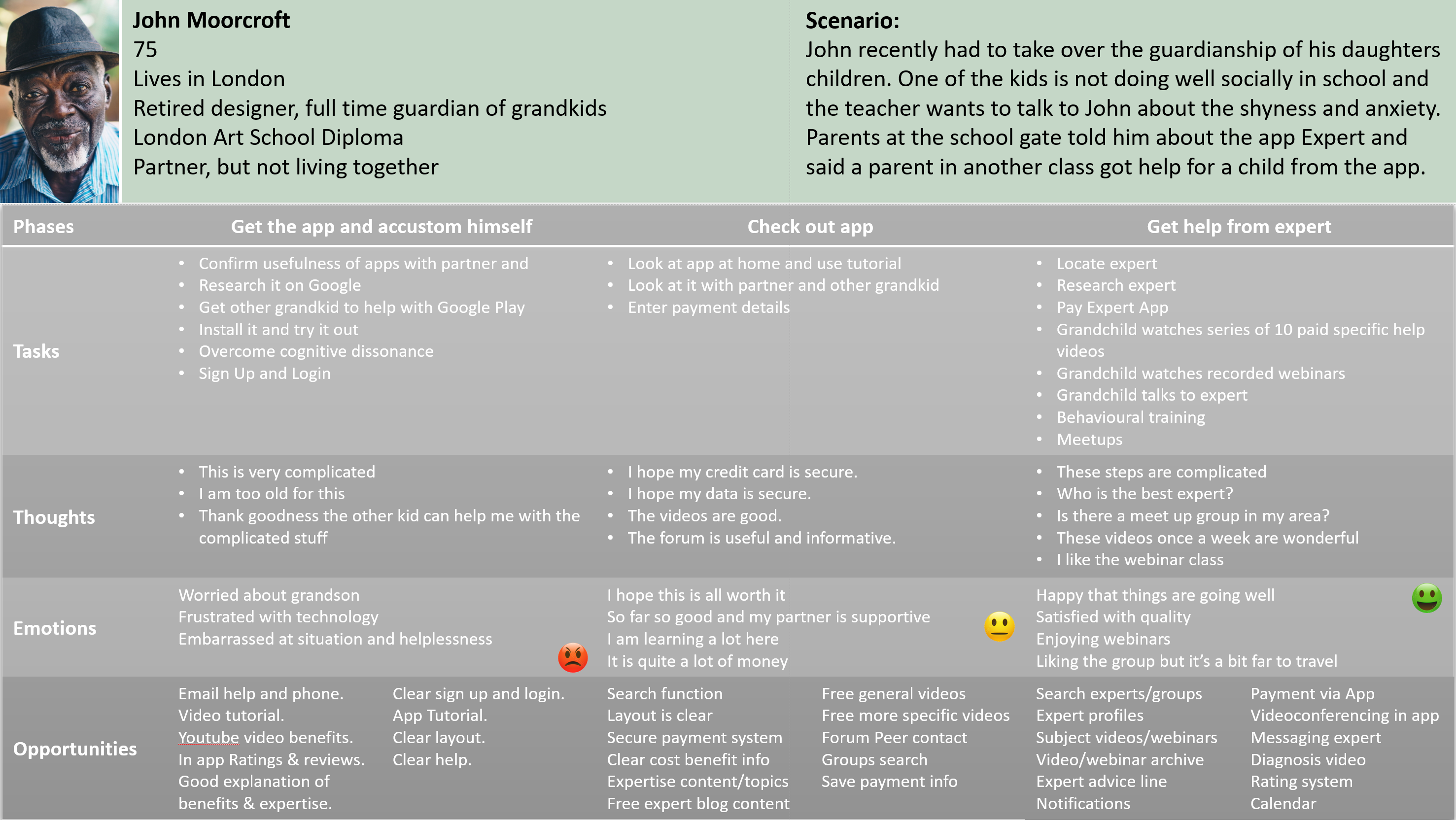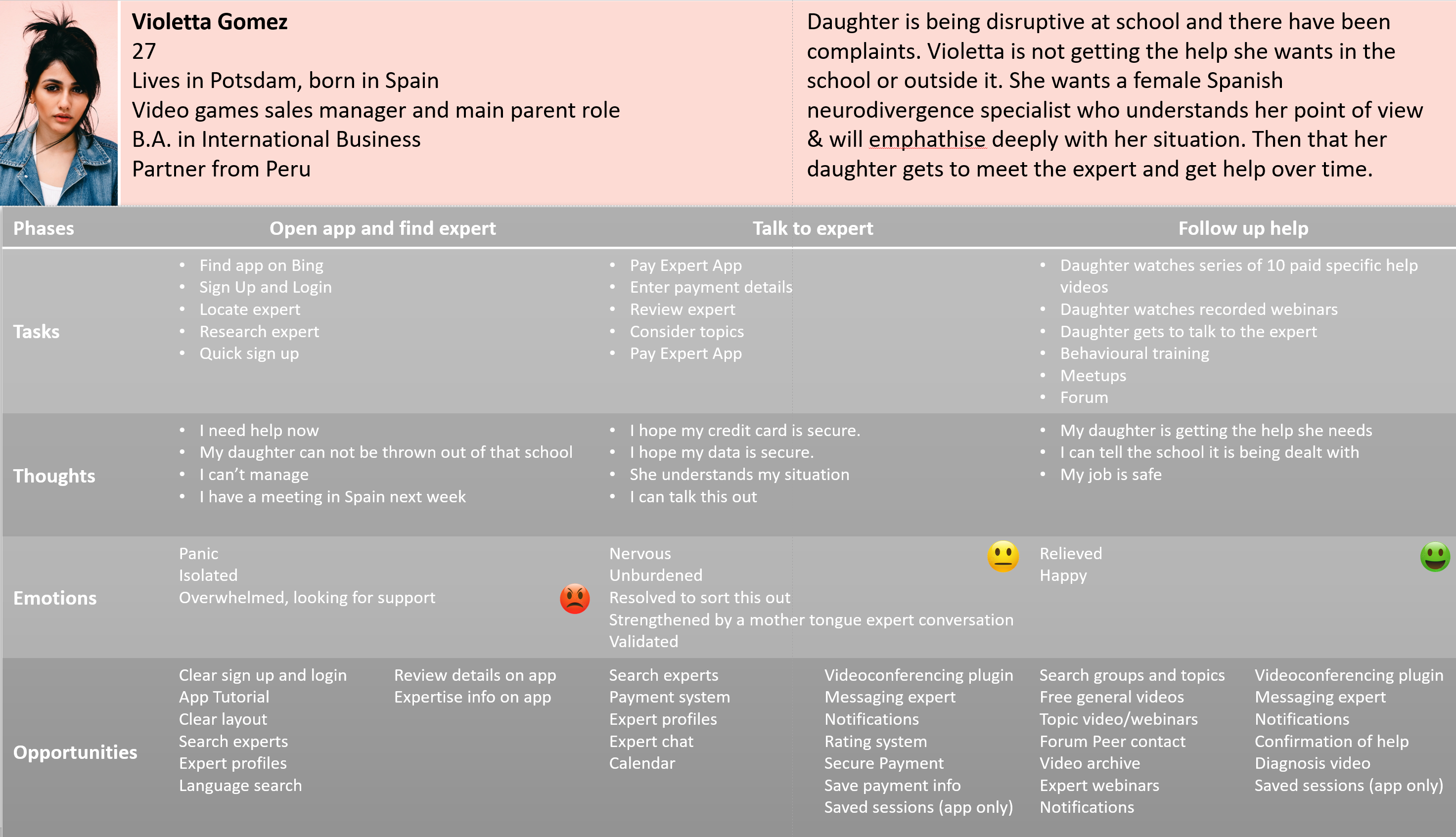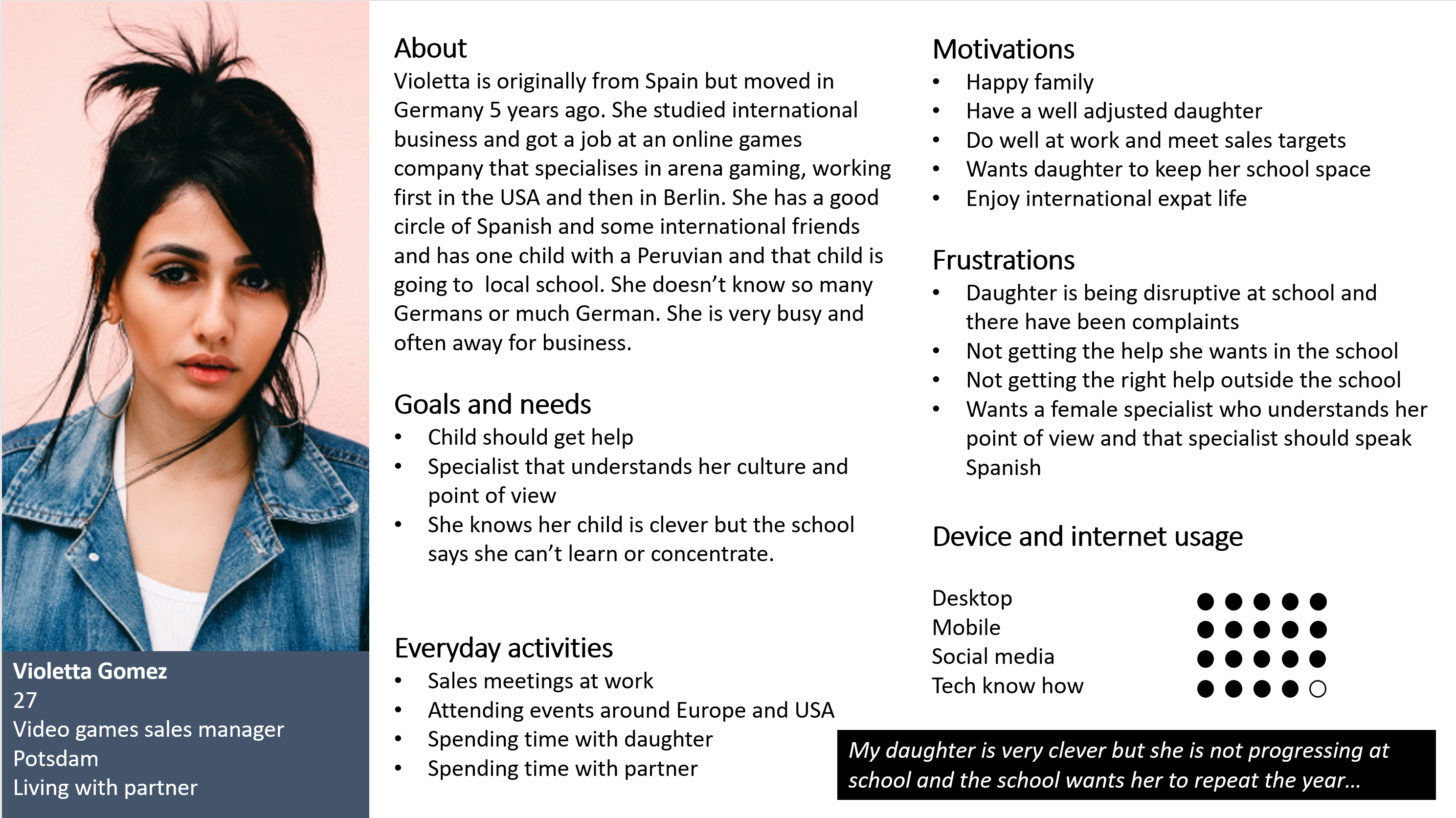 The findings and other research were used to create two personas. One was an elderly black grandfather guardian in London with a shy grandchild and the other a busy Spanish mother in Berlin with a girl with ADHD in danger of losing their school place. The personas had vivid stories and helped guide the app.