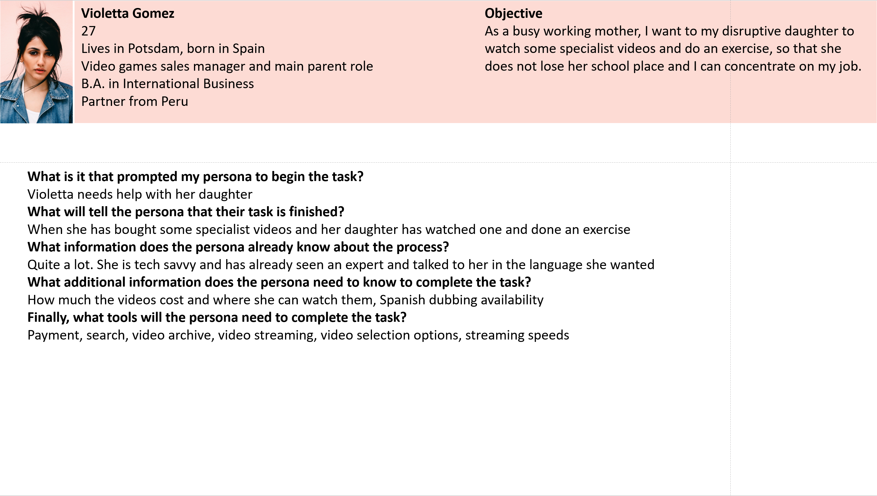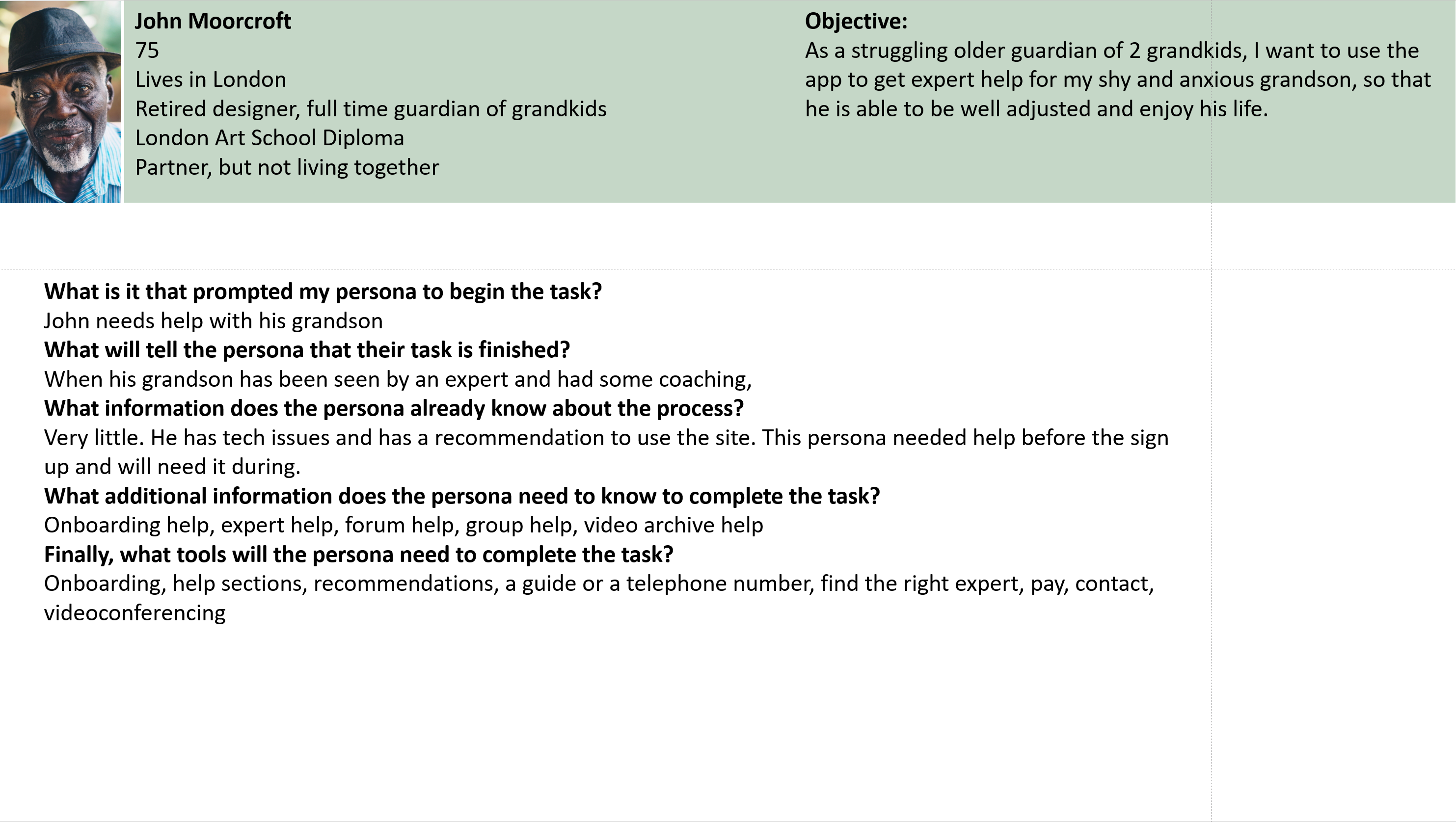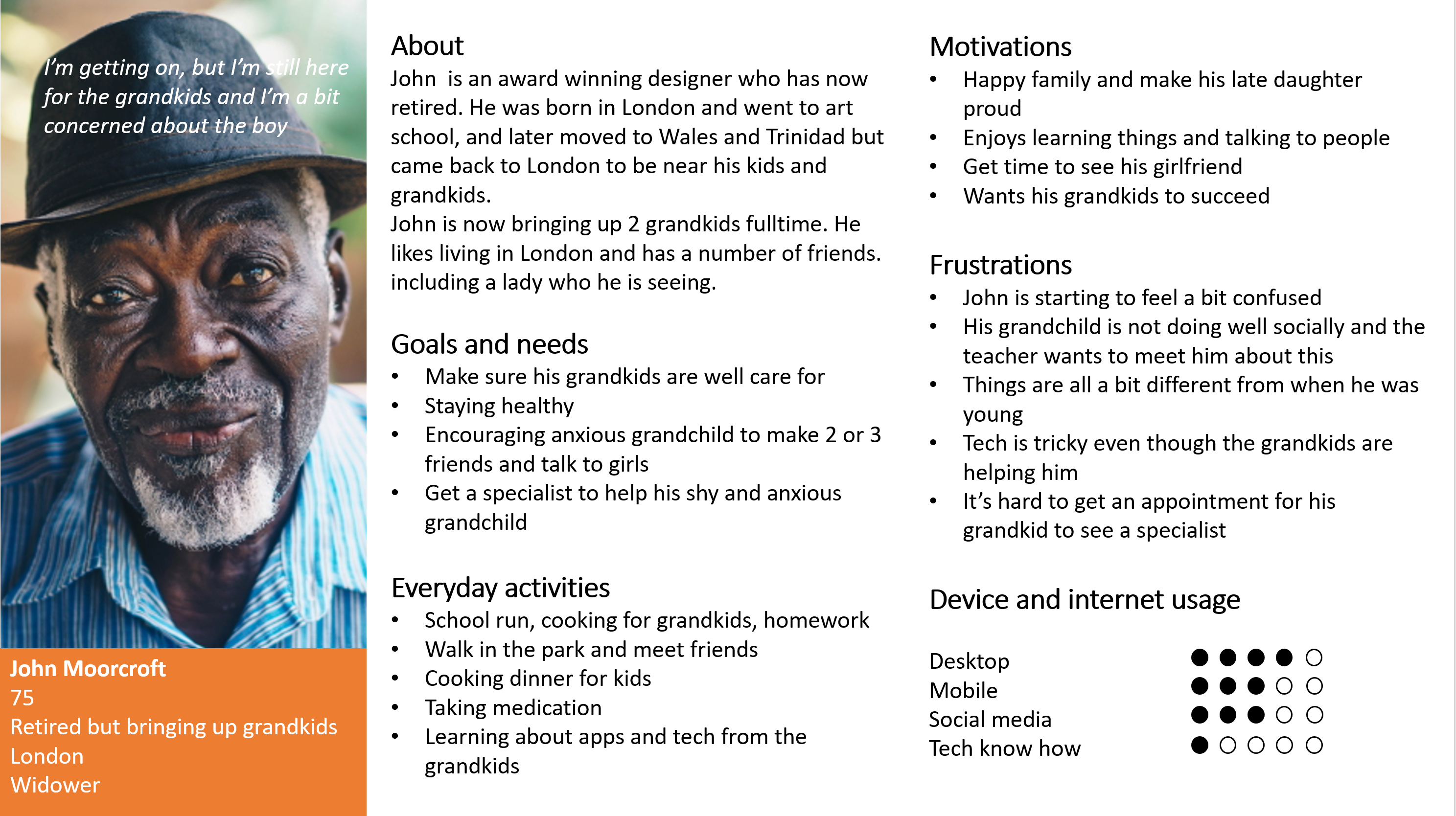 The findings and other research were used to create two personas. One was an elderly black grandfather guardian in London with a shy grandchild and the other a busy Spanish mother in Berlin with a girl with ADHD in danger of losing their school place. The personas had vivid stories and helped guide the app.