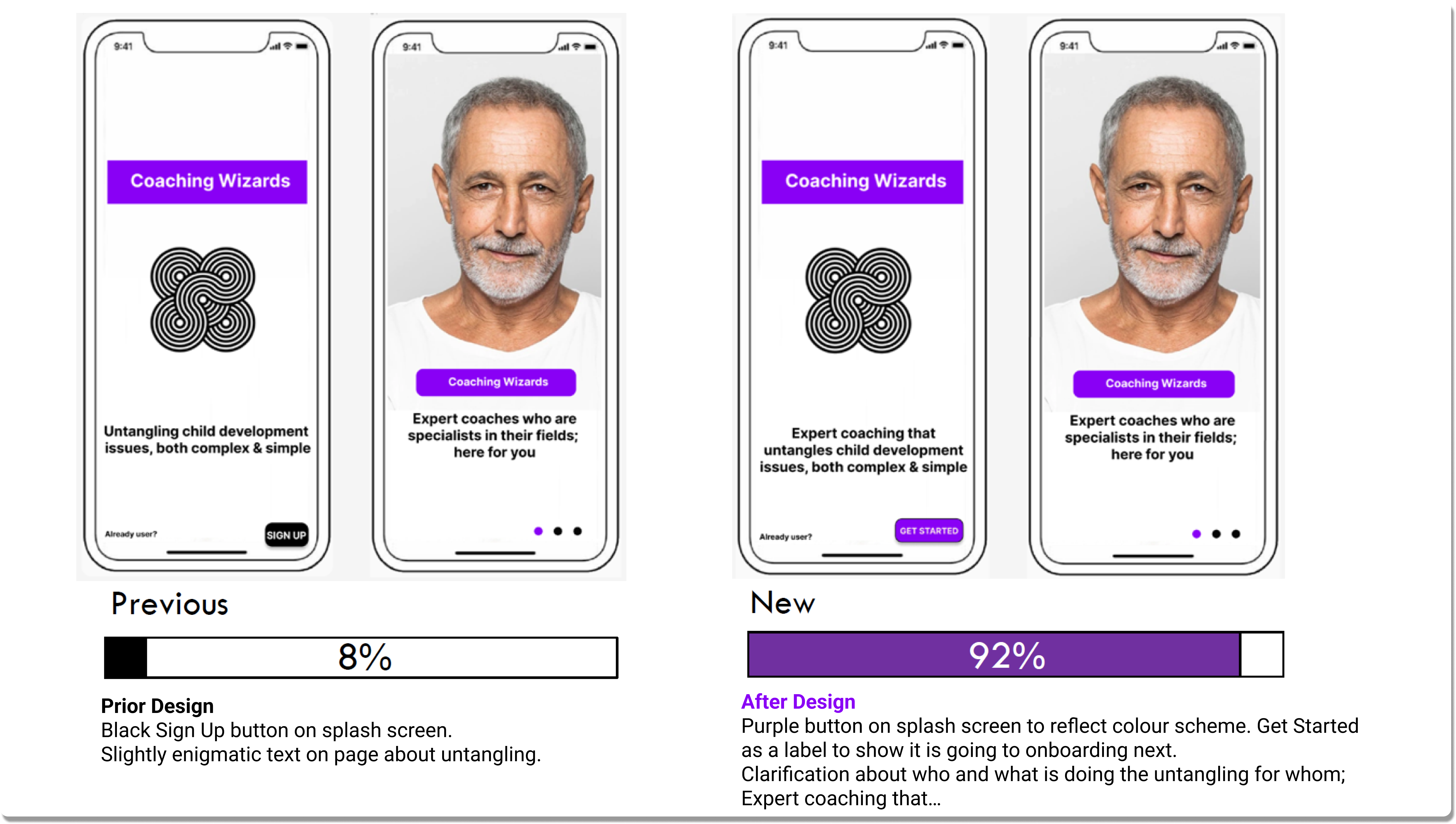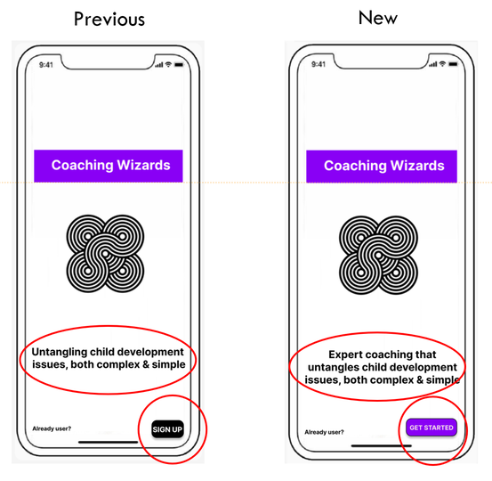 Suggested Change: Benchmark what firms use as text on buttons leading to onboarding and sign up. I did this and several large apps used the words Get Started. Those seem to work well. I will use those words and remain open to changes. A further change to this page is to add a little more information about the app and Coaching Wizards for people arriving with zero knowledge. I added the words Expert coaching that…
