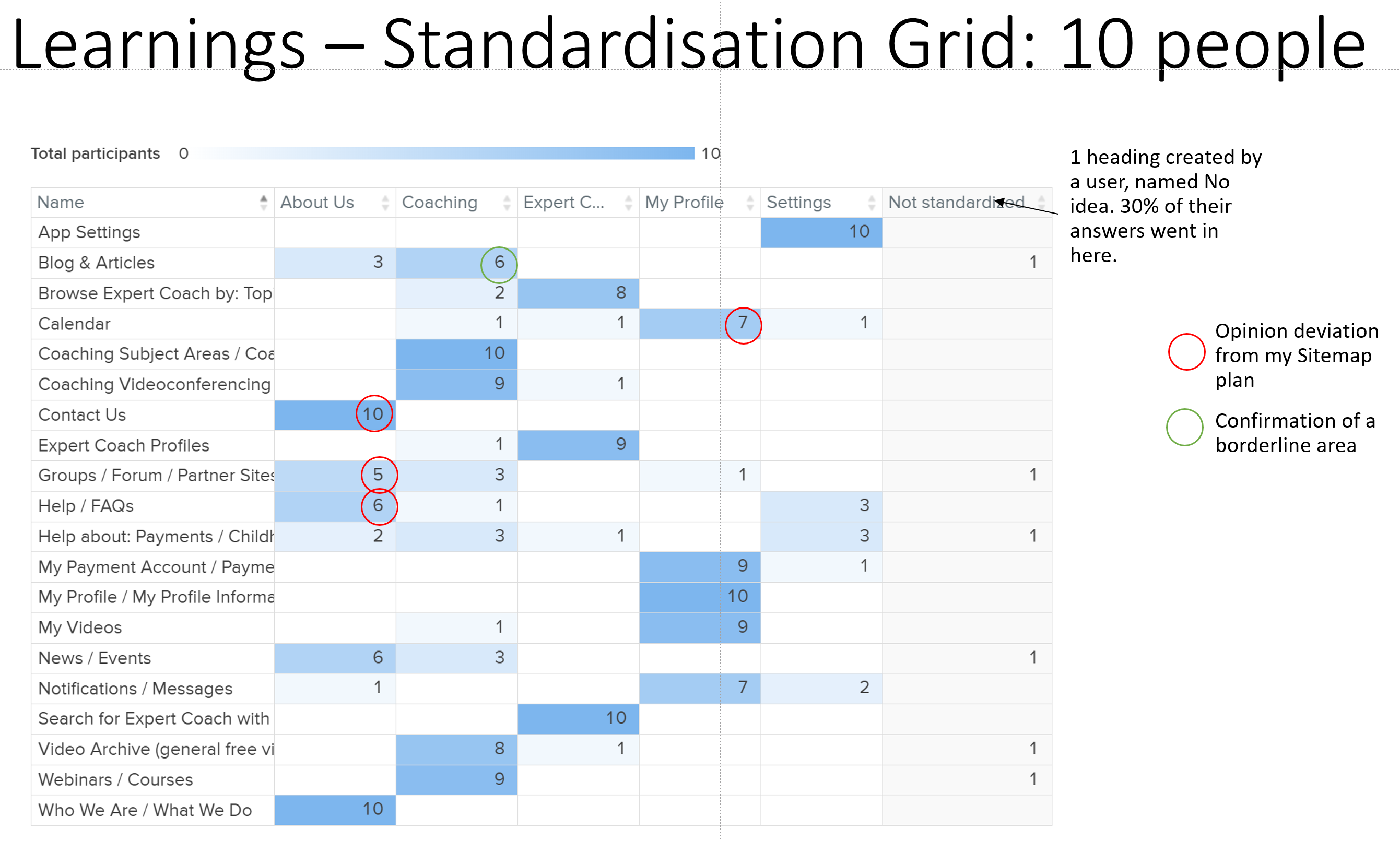 I used the ideas and results to create a Sitemap and implemented ideas about organisation. I then tested it via hybrid card sorting with 10 respondents via Optimal Workshop grouping under my titles but with flexibility to make their own titles too. I then analysed the results with a similarity matrix and standardisation grid.